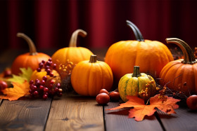 thanksgiving autumn pumpkin leaves berries wooden table fall harvest foliage nature seasonal holiday decoration centerpiece rustic cozy warm inviting colorful bright festive abundance grateful blessings family friends feast dinner gratitude celebration joy cheer harvest festival thanksgiving table autumn table pumpkin spice thanksgiving spirit autumn spiritImagine Buddy