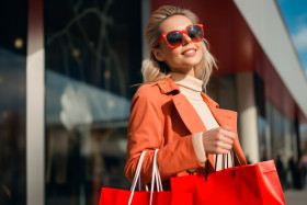 A young woman is carrying shopping bags near the mall in spring clothing, black friday deals