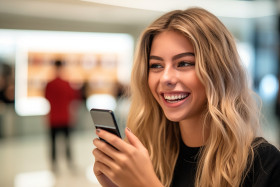 A picture of a young woman shopping in the mall who is looking at and using her smartphone, black friday deals