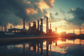 Industrial oil refinery with steam on sunset, industrial, manufa