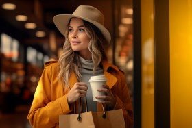 girl shopping bags drink hand photo attractive cute female woman young beautiful happy smiling winter fall autumn cold weather fashion lifestyle people portrait street urban outdoors city happy cheerful carefree relaxed content trendy stylish modern fashionable shopping spree consumerism retail retail therapy coffee tea latte cappuccino black fridayImagine Buddy