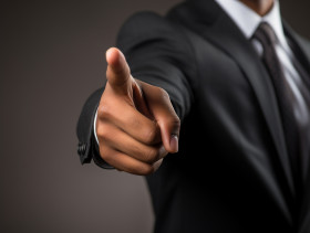 Businessman in business suit with finger up pointing at something with finger down on grey, seo stock images for marketing campaigns