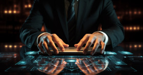 Businessman using a laptop on the desk and using laptop touch interface stock photo, seo stock images for marketing campaigns