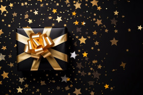 A photo of a flat lay of a black friday sale with a stylish gift box present and ribbon with gold star glitter on a black background, black friday sale