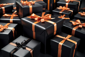 Black friday is a shopping day when stores sell gifts in black boxes with ribbons, black friday image