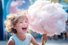 Picture of a happy young girl eating a giant fluff of cotton candy at a fun park in the summer