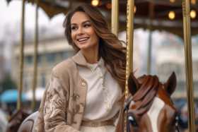 Photo of a woman in a beige coat walking in cloudy moscow in autumn enjoying herself on a carousel