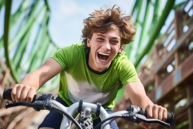 teenager boy happy roller coaster bobsled amusement park summer fun excitement thrill speed track rail ride scream laugh smile enjoyment adventure vacation holiday childhood memories childhood memories carefree happy childhood summer vacation summer holiday family fun friends togetherness outdoors sunshine blue sky white clouds green trees blue waterImagine Buddy
