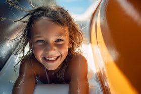 fun slide water park summer holiday girl child happy smiling laughter joy excitement thrill splash cool wet swimming adventure aquatic leisure activity recreation destination attraction family friends vacation getaway break memories happiness childhood carefreeImagine Buddy
