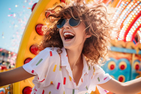 Photo of a woman having a fun and happy day at an amusement park on a summer day