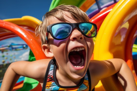 excited kid swimsuit goggles screaming happiness camera water slide park summer vacation fun joy laughter childhood freedom adventure thrill excitement speed splash cool wet water swimming aqua park amusement park amusement ride holiday recreation leisure activity outdoors sunshine happy carefree playful energetic vibrant dynamic joyful ecstatic delighted thrilledImagine Buddy