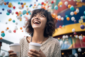 smiling female coffee cup amusement park summer vacations fall childhood mood happy carefree joyful fun excitement adventure laughter memories nostalgia innocence youth freedom happiness joy bliss amusement rides roller coasters ferris wheel carousel bumper cars arcade games cotton candy popcorn ice cream hot dogs summer clothes hat sunglasses sneakers day trip family outing friends fun day out happy memoriesImagine Buddy