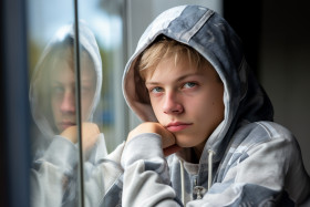 A thoughtful teenager looking at their reflection in a window