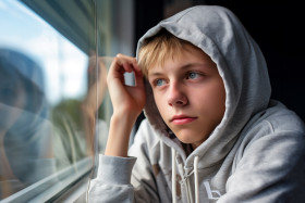 A thoughtful teenager looking at their reflection in a window