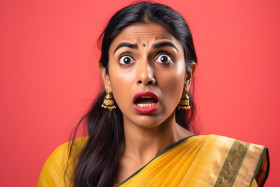 A photo of a stunned indian woman using her phone to look at shocking news online with a yellow background