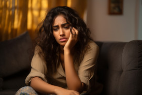 Photo of a sad young indian woman on the couch at home looking into the distance and thinking about her life problems