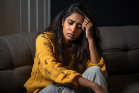 upset depressed young indian woman sitting couch home sad mourning worrying anxious millennial ethnic girl resting sofa lost thoughts thinking life relationships problems depression anxiety sadness loneliness despair negative emotions contemplation introspection lifestyle teenagers indoorsImagine Buddy