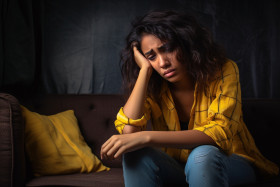 upset depressed young indian woman sitting couch home sad mourning worrying anxious millennial ethnic girl resting sofa lost thoughts thinking life relationships problems depression anxiety sadness loneliness despair negative emotions contemplation introspection lifestyle teenagers indoorsImagine Buddy