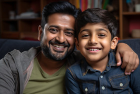 indian father son happy family love bond home sofa portrait smiling looking at camera togetherness quality time parenting childhood fatherhood childhood memories childhood moments father's love unconditional love happy family family photo family time family portrait family moments indian culture indian family indian values tradition heritage love of family happy home lifestyle teenagers indoorsImagine Buddy
