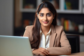 indian woman young adult student freelancer teacher happy camera home office table laptop computer work study online education learning business success career womanpower female technology digital lifestyle modern india culture diversity inclusion remote lifestyle teenagers indoorsImagine Buddy