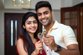 indian family couple happy house keys new home excited dream achievement milestone purchase investment real estate property mortgage celebrate success joy love togetherness future beginning happiness smile laughter excitement anticipation new chapter new beginnings homeownership family goalsImagine Buddy