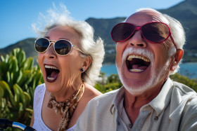 cheerful middle aged woman husband pensioner shocked news reacts keeps hand spectacles isolated blue background couple family seniors elderly mature happy surprised amazed astonished stunned delighted overjoyed excited excited reaction expression emotions portrait people lifestyle social relationships love support togetherness unity happiness joy celebrationImagine Buddy