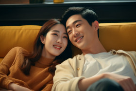 couple asian millennial happy home couch resting relaxation smiling togetherness love comfort contentment peace joy relax chill cozy bonding bliss affection intimacy happiness harmony couple goals lovebirds newlyweds romance domestic bliss marital bliss family life parenthood home sweet home empty space copy space negative space living room lifestyle love story together forever happily ever after portrait family portraitImagine Buddy