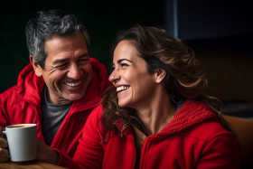 Happy hispanic couple drinking coffee