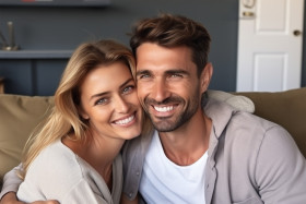 eastern millennial couple man woman comfy casual outfit cuddling home loving cheerful portrait smiling happy together bonding sweet romantic couple goals lovebirds soulmate happiness joy affection tenderness warmth intimacy connection relationship familyImagine Buddy