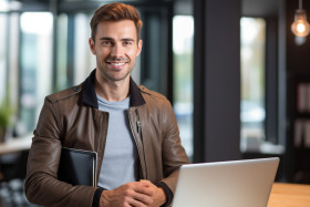 businessman young man handsome portrait laptop office interior posing business professional technology success confidence innovation startup business casual headshot smile happy motivated driven ambitious successful leader visionary inspiration role model motivation inspiration goals lifestyle indoors adultsImagine Buddy