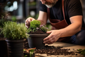 male employee flowerpot soil house plant store interior filling plant pot worker man potting soil gardening planting growing indoor plants houseplants greenery flora nature green business retail customer service sales employment job occupation career retail store shopping commerce lifestyle indoors adultsImagine Buddy