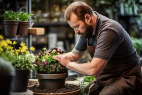 male employee flowerpot soil house plant store interior filling plant pot worker man potting soil gardening planting growing indoor plants houseplants greenery flora nature green business retail customer service sales employment job occupation career retail store shopping commerce lifestyle indoors adultsImagine Buddy