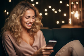 Smiling woman on couch using phone apps