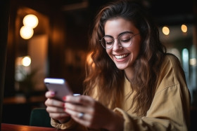 woman young pretty smiling happy cellphone smartphone modern technology table sitting using holding social media texting browsing internet communication connection business work education entertainment shopping fun lifestyle portrait female people girl lady mobile phone device screen digital wireless lifestyle indoors adultsImagine Buddy
