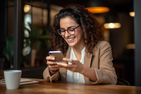 woman young pretty smiling happy cellphone smartphone modern technology table sitting using holding social media texting browsing internet communication connection business work education entertainment shopping fun lifestyle portrait female people girl lady mobile phone device screen digital wireless lifestyle indoors adultsImagine Buddy