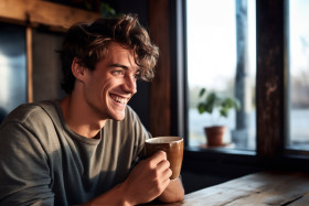 man coffee home smiling happy morning relax breakfast cup drink mug lifestyle adult portrait male people person caucasian indoors lifestyle coffee lover caffeine coffee time aroma beverage steam breakfast coffee casual coffee break coffee cup coffee mug enjoyment energy hot refreshment smileImagine Buddy