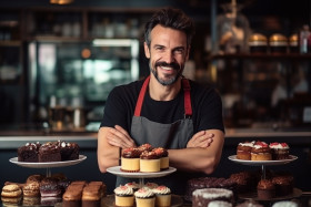 coffee shop owner male showcase cakes desserts cafe bakery pastry food beverage sweet delicious yummy tasty eat drink enjoy relax break work socialize meet friends family business customer service small business local business entrepreneur success happy friendly welcoming warm inviting cozy comfortable atmosphere ambiance lifestyle indoors adultsImagine Buddy