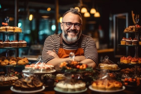 coffee shop owner male showcase cakes desserts cafe bakery pastry food beverage sweet delicious yummy tasty eat drink enjoy relax break work socialize meet friends family business customer service small business local business entrepreneur success happy friendly welcoming warm inviting cozy comfortable atmosphere ambiance lifestyle indoors adultsImagine Buddy