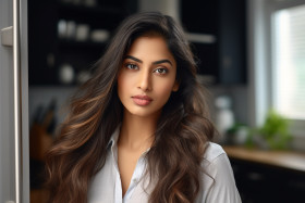 confident young pretty indian ethnicity woman looking camera alone home kitchen smile happy beautiful millennial hindu lady housewife india indoors close-up face front headshot portrait lifestyle people home decor interior design domestic life everyday life cooking food kitchenware appliances home cooking breakfast lunch dinner snack indoors adultsImagine Buddy