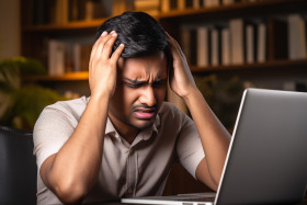 indian business man exhausted headache temple massage modern home office laptop desk work stress burnout migraine overworked tired fatigue employee professional career health wellness productivity efficiency performance success achievement motivation inspiration dedication hard work determination perseverance resilience grit hustle grind lifestyle indoors adultsImagine Buddy