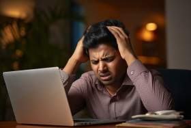 indian business man exhausted headache temple massage modern home office laptop desk work stress burnout migraine overworked tired fatigue employee professional career health wellness productivity efficiency performance success achievement motivation inspiration dedication hard work determination perseverance resilience grit hustle grind lifestyle indoors adultsImagine Buddy
