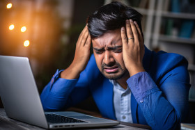 indian business man exhausted headache temple massage modern home office laptop desk work stress burnout migraine overworked tired fatigue employee professional career health wellness productivity efficiency performance success achievement motivation inspiration dedication hard work determination perseverance resilience grit hustle grind lifestyle indoors adultsImagine Buddy
