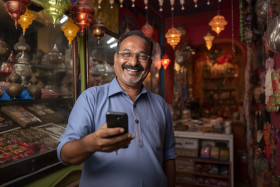 Photo of indian shopkeeper showing phone to camera