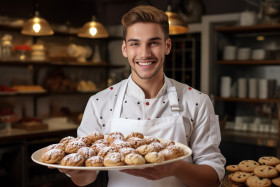 shopping and retail men realistic cookies young man apron tray bakery shop fresh delicious sweet yummy tasty dessert snack treat chocolate vanilla oatmeal peanut butter sugar oven baking baker baker shop small business friendly smiling happy customer service food photography image picture food photography portrait lifestyle business small business owner entrepreneur success satisfaction happiness joyImagine Buddy