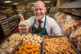 shopping and retail men realistic salesman happy thumbs up grocery store products food shopping market supermarket employee worker staff fresh healthy produce meat seafood dairy bakery frozen foods snacks beverages aisle shelf display brand label price sale discount coupon promotion offer promotion satisfied customer friendly service assistance help satisfaction qualityImagine Buddy
