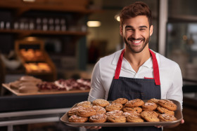 shopping and retail men realistic cookies young man apron tray bakery shop fresh delicious sweet yummy tasty dessert snack treat chocolate vanilla oatmeal peanut butter sugar oven baking baker baker shop small business friendly smiling happy customer service food photography image picture food photography portrait lifestyle business small business owner entrepreneur success satisfaction happiness joyImagine Buddy