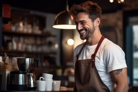 shopping and retail men realistic coffee barista apron cup smile camera counter cafe coffee shop man young handsome enjoy your side view standing looking portrait male person people food drink beverage caffeine energy morning breakfast lunch break happy joyful cheerful friendly welcoming inviting warm professional business service customer business owner entrepreneur successImagine Buddy