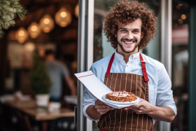 Cheerful italian bakery worker inviting customers in with menu