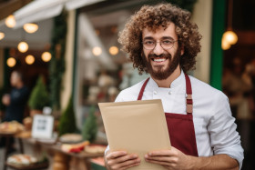 shopping and retail men realistic worker bakery menu shop portrait cheerful curly unrecognizable inviting food bread pastry cake dessert delicious tasty fresh baked baked goods baking small business local community small town traditional culture heritage happy friendly smile welcome customer service shopping invitation come in open now here availableImagine Buddy