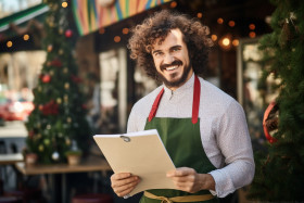 shopping and retail men realistic worker bakery menu shop portrait cheerful curly unrecognizable inviting food bread pastry cake dessert delicious tasty fresh baked baked goods baking small business local community small town traditional culture heritage happy friendly smile welcome customer service shopping invitation come in open now here availableImagine Buddy